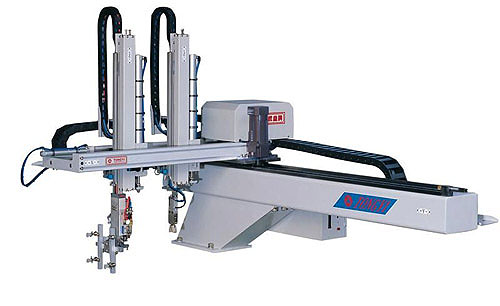 轻型横走式机械手 LIGHT WEIGHT SIDLE ROBOT 结构和功能: 1.横行轴采用无杆缸驱动或变频马达驱动(也可以选购AC伺服马达驱动),上下及引拔轴使用气缸驱动。 2.横行、上下手臂均采用进口的高刚性铝合金挤型梁与线性滑轨,配合高刚性轴承钢,能达到取出速度快、高效能、高精度、使用寿命长的要求。 3.双截式手臂采用特殊设计的皮带倍速机构,可缩短上下手臂的结构高度,上下气缸只需一半的行程即可达到全行程和配合厂房较低之场所。 4.侧姿倒角机构可配合动模或定模取出和固定倒角90度。 5.治具预留气压管路与检测讯号,预留一吸一抱两个回路,可供吸夹抱等治具的取出应用,可应用于各种成品多样化的取出。 6.无杆缸驱动TYA-550/650横行轴采用进口无杆缸驱动,配合高刚性精密线性滑轨,动作平稳、顺畅、耐磨和使用寿命长,两端均采用气压缓行及油压缓行器,停止平稳。 |